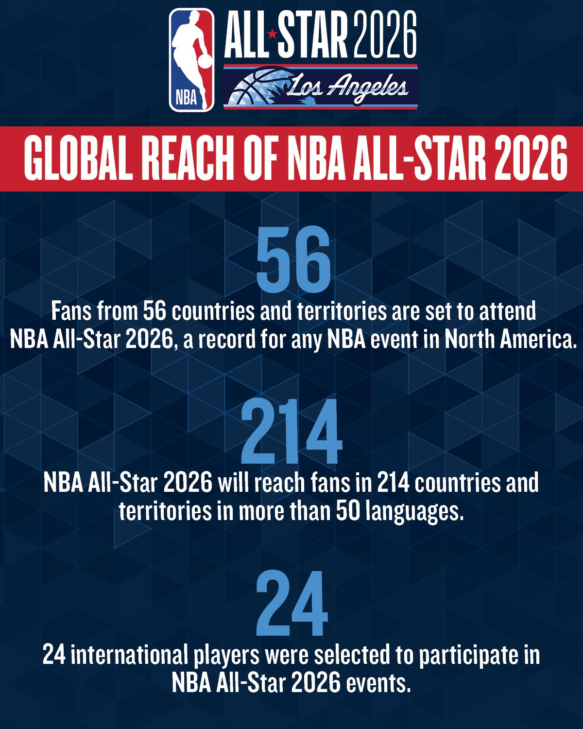 Fans from 56 countries and territories are set to attend NBA All-Star 2026, a record for any NBA event in North America. NBA All-Star 2026 will reach fans in 214 countries and territories in more than 50 languages on their televisions, computers, mobile phones and tablets.