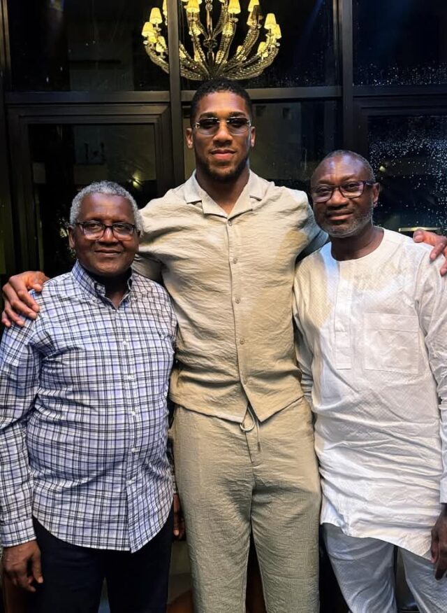 Anthony Joshua, known for his humility and strong ties to his roots, kept his appearance casual as he posed with Dangote, Africa’s richest man and founder of Dangote Group, and Femi Otedola, a renowned Nigerian businessman and philanthropist.