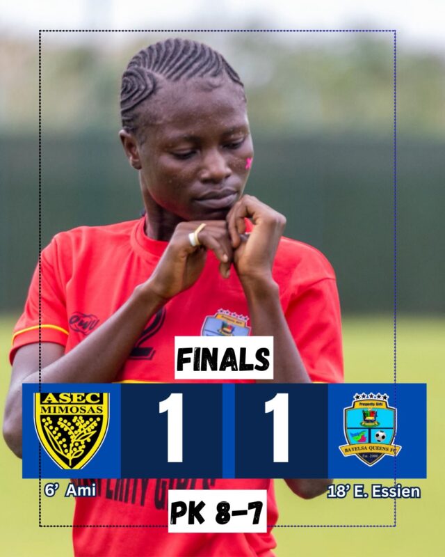 ASEC Mimosas Ladies have secured the 2025 WAFU B Women’s Champions League ticket after a thrilling 8-7 penalty shootout victory over Nigeria’s Bayelsa Queens in the final at the Charles Konan Banny Stadium, Yamoussoukro, on Friday.