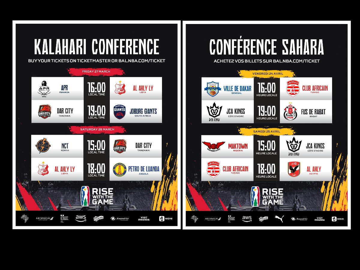 The league’s sixth season will feature the top 12 club teams from 12 African countries playing a total of 42 games across the Kalahari Conference group phase from March 27 – Sunday, April 5 in Pretoria, the Sahara Conference group phase from Friday, April 24 – Sunday, May 3 at the Prince Moulay Abdellah Sports Complex in Rabat, Morocco, and the Playoffs and Finals from Friday, May 22 – Sunday, May 31 at BK Arena in Kigali, Rwanda.