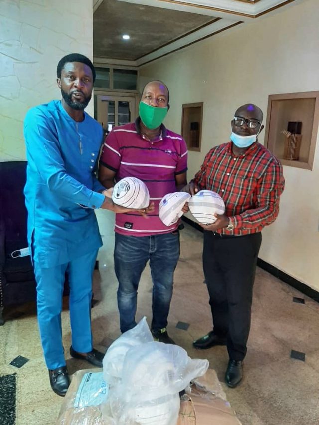 Receiving the balls on behalf of these senatorial districts are Mr. Kindness Ohiwere, who is a Board member representing the Edo Central Senatorial district in the Edo State Football Association and, as well as a Member of the Management team of BJ Foundation Football Club of Benin.