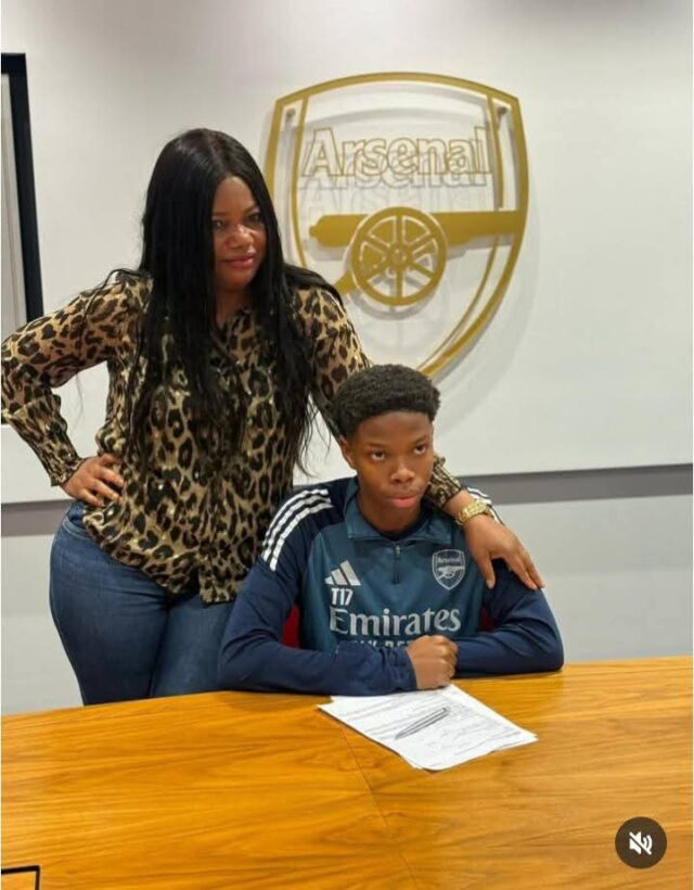 The midfielder’s proud mother and family were in attendance to witness the special moment as he put pen to paper at Arsenal’s academy headquarters — a memorable occasion for both the player and his loved ones.