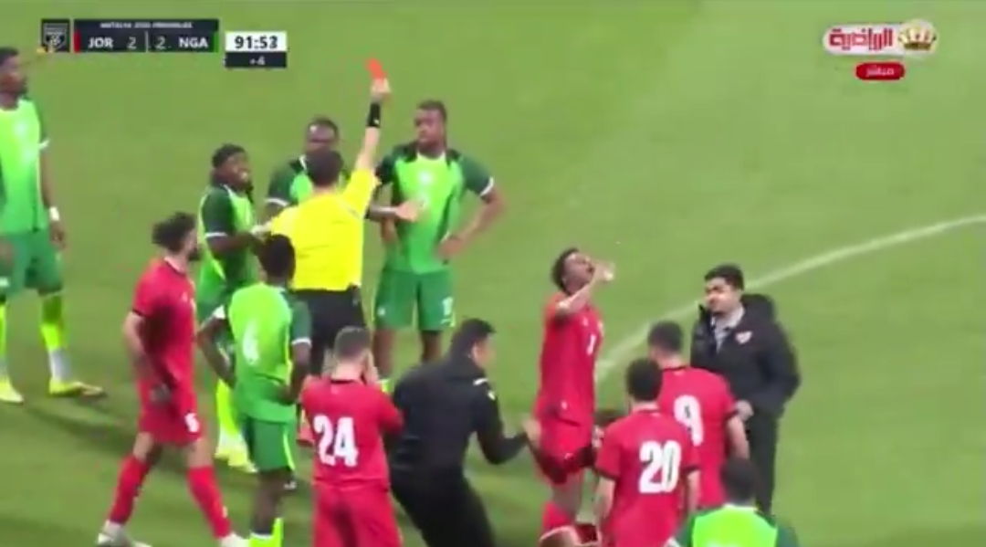 “With the score at 2-2, Iwobi saw red when he took exception to a pull back and jumped on his opponent. Attempting to break, the Fulham man was pulled back by Jordan captain Amer Jamous in an obvious professional foul.