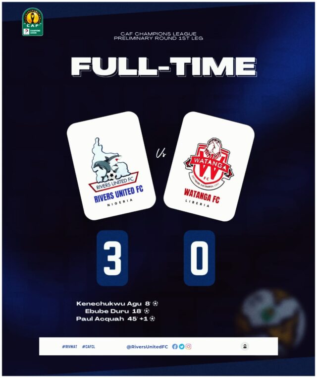 However, Rivers United tore Watanga FC apart with two early goals in the space of 10 minutes, a bullet from Kenechukwu Agu and a cool finish by dependable left back Ebube Duru, with Paul Acquah heading home a superb third to put the game to bed in the first 45 minutes.