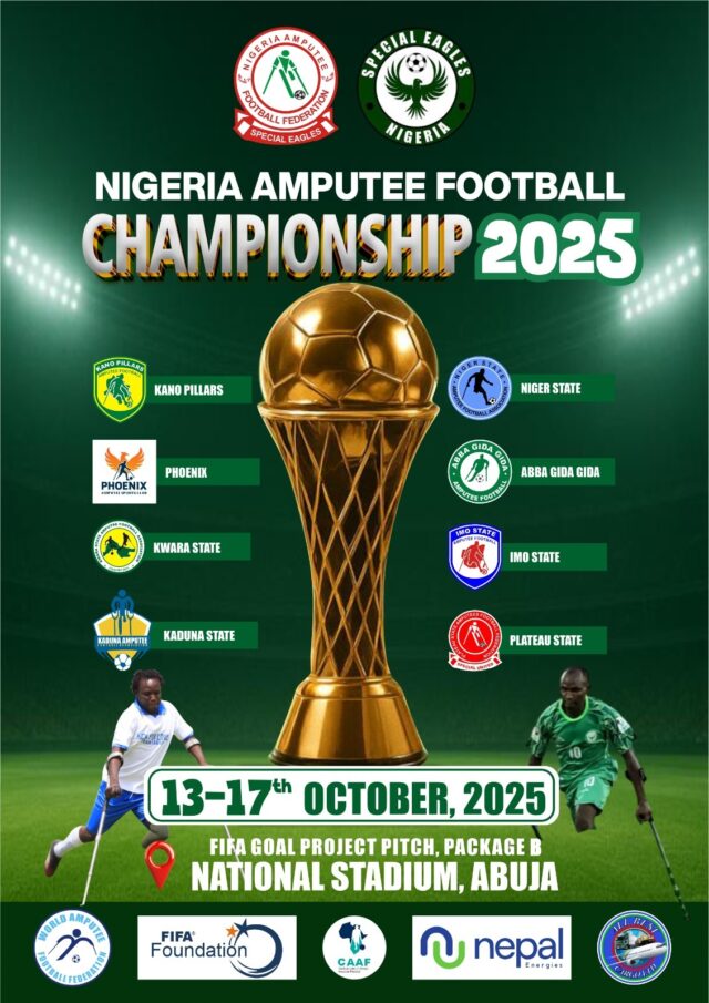 The stage is set for an intense showdown as eight teams converge on Abuja for the National Amputee Football Championship, kicking off from October 13 to 17, 2025, at the FIFA Goal Project, MKO Abiola Stadium.