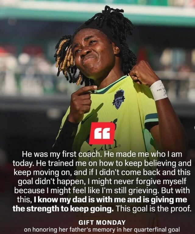 Super Falcons’ attacker, Gift Monday took some time out to talk about her late father, after scoring for Washington Spirit of USA in the National Women’s Soccer League (NWSL).