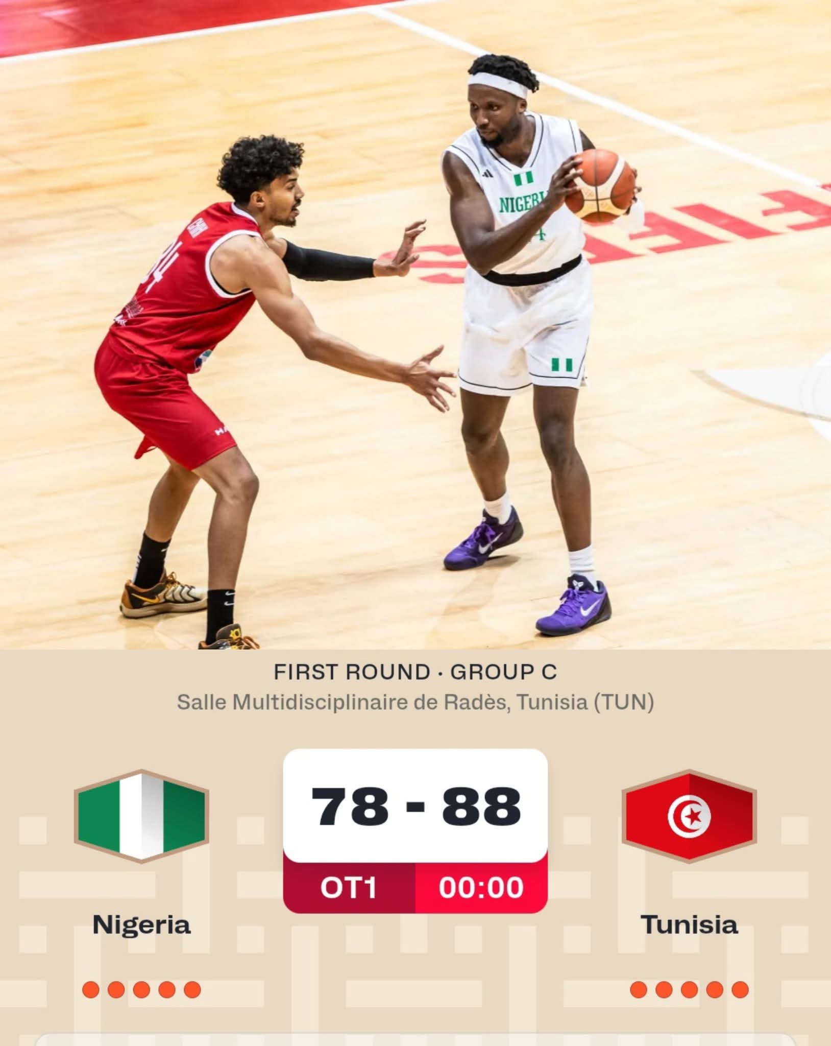 Nigeria’s men’s national basketball team suffered an overtime defeat to hosts Tunisia, losing 78–88 in their opening FIBA World Cup African Qualifier clash on Thursday.