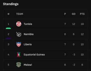 Liberia’s loss to Tunisia means they stay third.