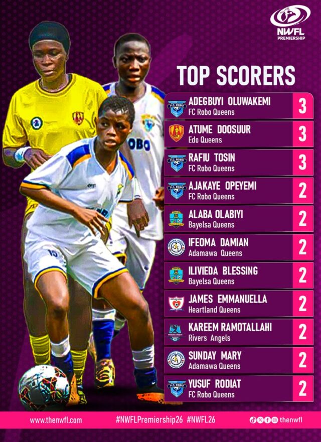 Oluwakemi Adegbuyi and Rafiu Tosin have been in fine form for Robo Queens, each finding the net three times, while Atume Doosuur has matched their tally with three goals for Edo Queens. Their early-season consistency has set the tone for what promises to be an exciting goalscoring battle.