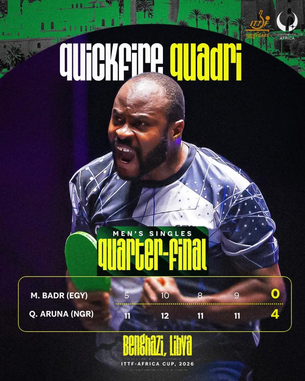 Quadri Aruna reaffirmed his dominance on the African table tennis scene with a polished display that earned him a place in the men’s singles semi-finals of the ITTF Africa Cup 2026 in Benghazi, Libya.
