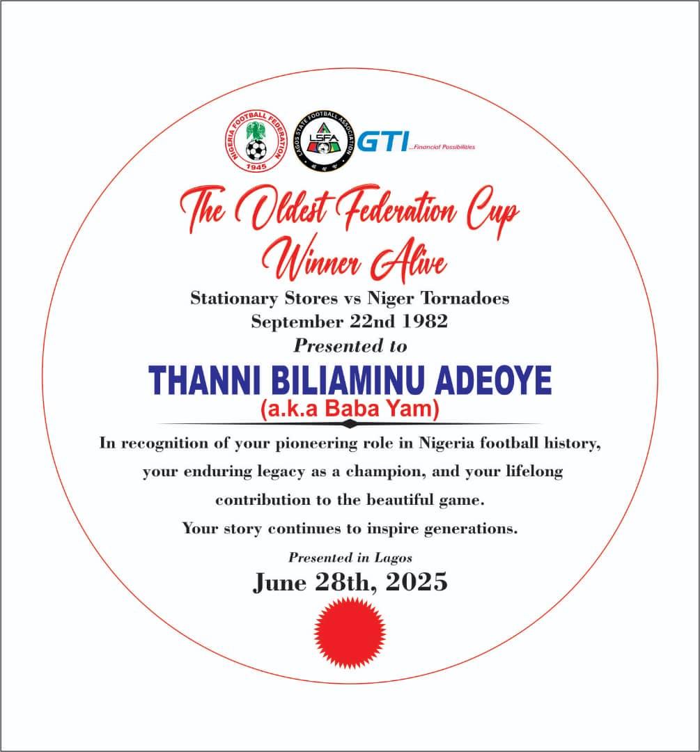 The Lagos FA, under the leadership of Chairman Hajji Gafar Liameed, has announced that Thanni will be honored with the Lifetime Achievement Award during the grand finale of the 2025 President Federation Cup, taking place this Saturday at the Mobolaji Johnson Arena, Onikan.