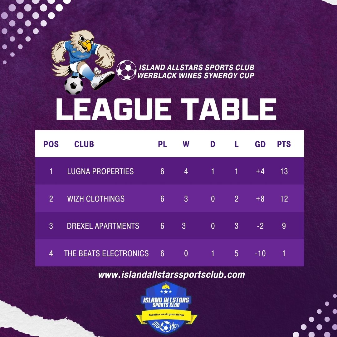 In the title-deciding fixture, Lugna Properties defeated Drexel Apartments 2–0, with goals in the 38th and 58th minutes. A crucial save in the 71st minute preserved their lead, and the result pushed Lugna to 13 points, sealing the Synergy Cup crown.