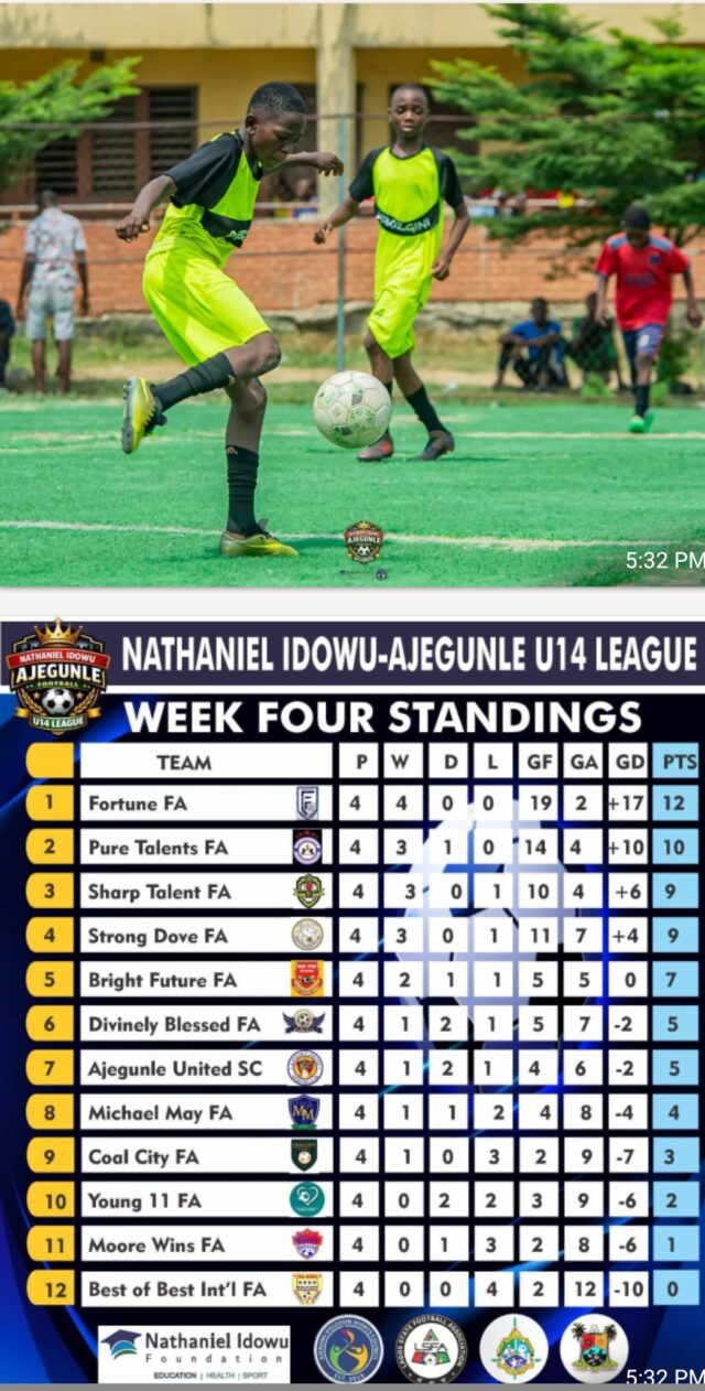 Week Four of the Nathaniel Idowu–Ajegunle Under-14 Football League delivered excitement, goals, and standout performances, as another thrilling round of grassroots football came to a fitting climax.