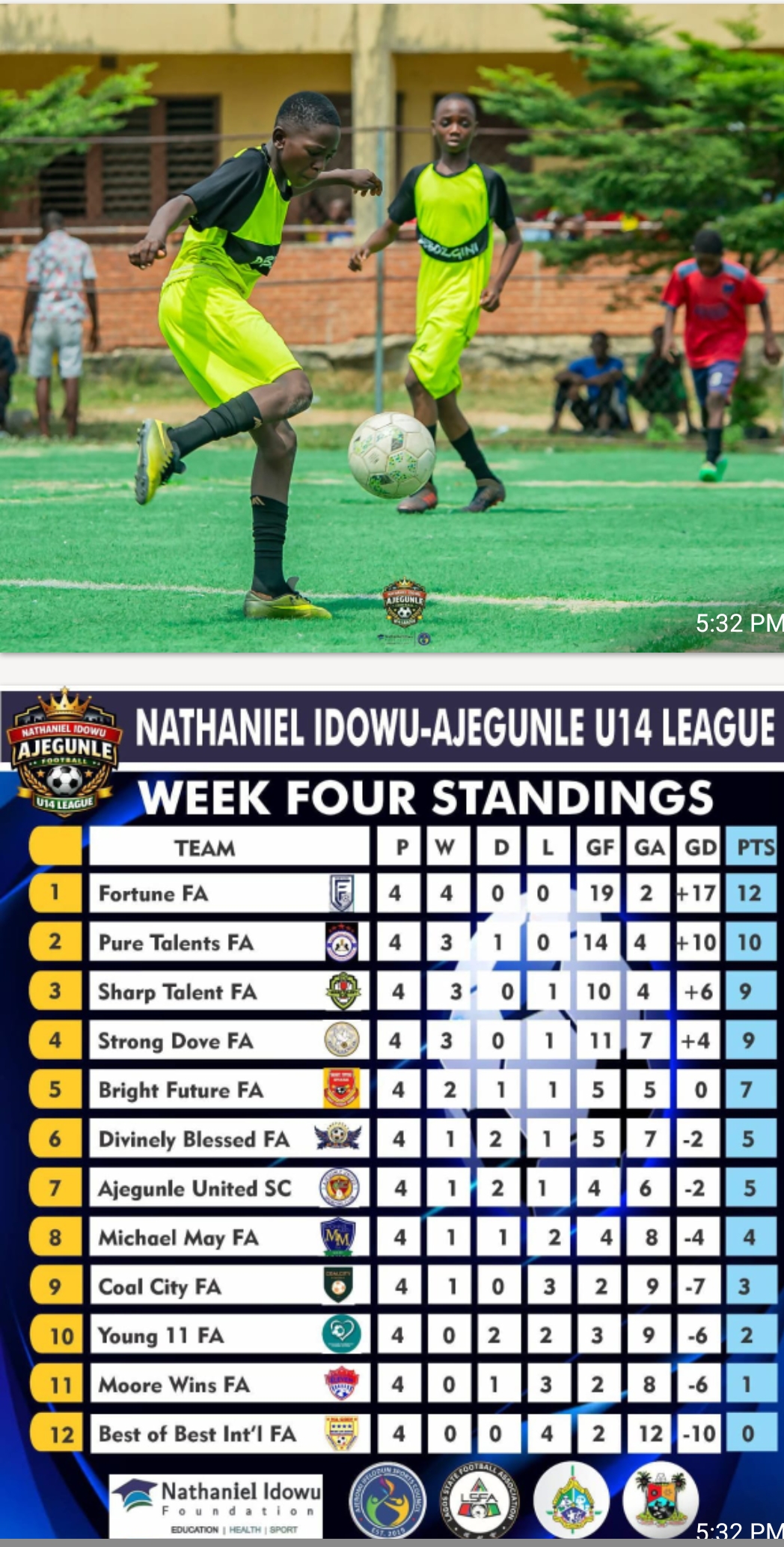 With competition intensifying and the race for honours gathering momentum, the Nathaniel Idowu–Ajegunle Under-14 Football League continues to highlight the passion, talent, and promise of grassroots football. Fans can expect even more excitement when the next round of fixtures kicks off.