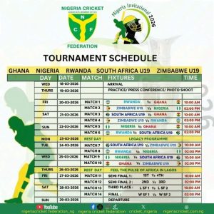 The tournament, organized by the Nigeria Cricket Federation, will take place from March 20 to March 28, 2026 at the Tafawa Balewa Square Cricket Oval, bringing together five teams from across the African cricket community.