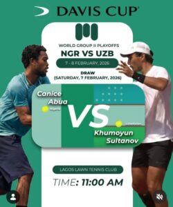 Action begins on February 7 at 11 a.m. with Nigeria’s Canice Abua taking on Uzbekistan’s Khumoyun Sultanov in the opening singles rubber. Daniel Adeleye will then face Abdulaziz Usmonjonov, scheduled to start 15 minutes after the first match.