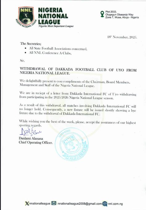 Dakkada, who only recently dropped from the Nigeria Premier Football League, had announced last week that they were pulling out of the current campaign. The NNL board on Tuesday acknowledged receiving the club’s formal notification, bringing an end to days of speculation over the status of the Uyo-based side.