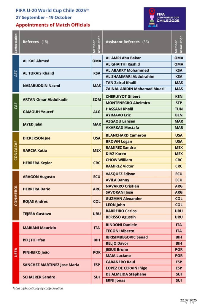 In a development that has raised eyebrows within Nigerian football circles, the Fédération Internationale de Football Association (FIFA) has released the list of match officials for the upcoming 2025 U20 World Cup in Chile — and not a single Nigerian referee or assistant referee has been included.