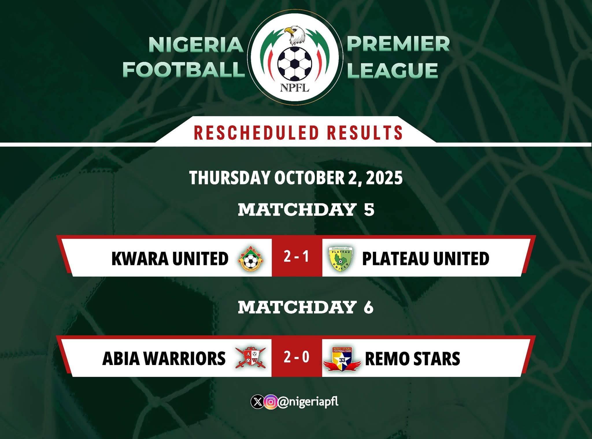 In Umuahia, Abia Warriors defeated Remo Stars 2-0 in a Matchday 6 clash.