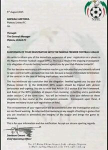 A letter dated 5th August 2025 duely signed by the NPFL Chief Operating Officer Davidson Owumi reveals the Nigeria Premier Football League forwarded through Plateau United General Manager over the suspension of one of their players, which was a result of an ongoing investigation into allegation of insider betting levelled against Adewale Adeyinka.