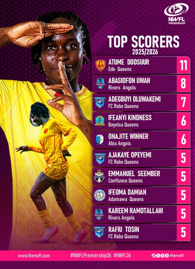 Leading the pack is Atume Doosuur of Edo Queens, who has found the back of the net 11 times this season. Her clinical form in front of goal has given her a three-goal cushion at the top, placing her firmly in control of the Golden Boot race.