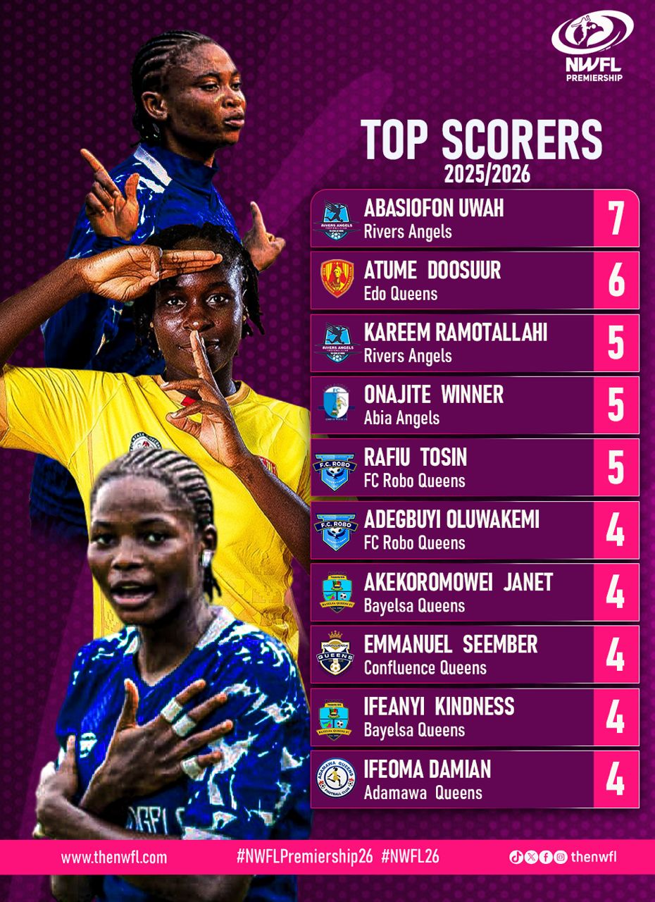 Leading the charts is Abasiofon Uwah of Rivers Angels FC, who has netted seven goals in a clinical first-round display. Uwah’s consistency and ability to deliver in big moments have made her a central figure in Rivers Angels’ attacking threat.