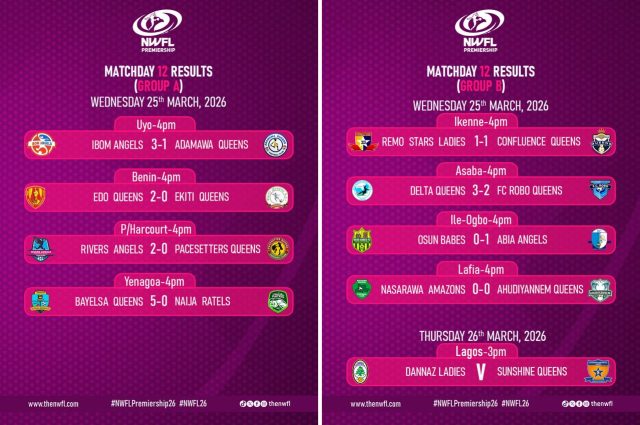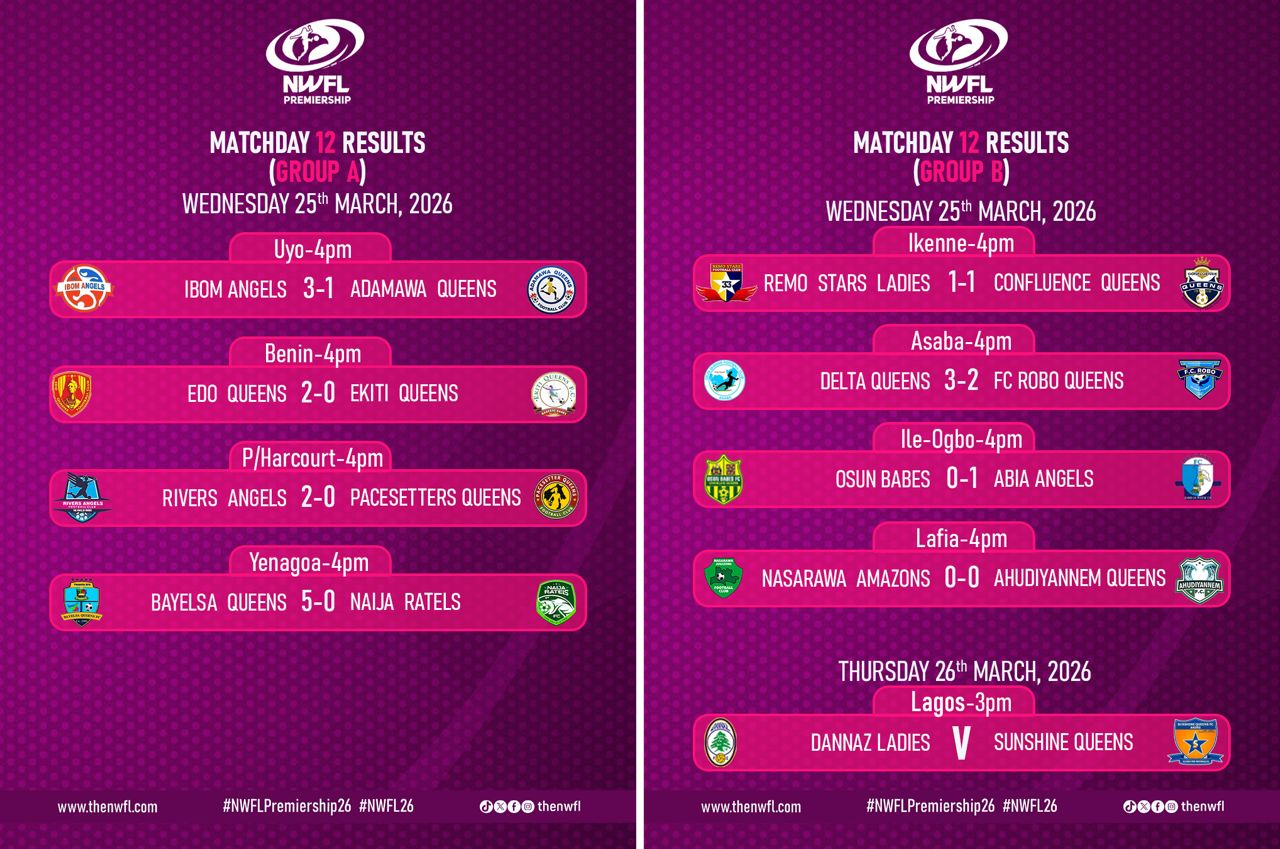 Matchday 12 highlighted the league’s competitiveness and unpredictability. Bayelsa Queens’ commanding performance, Delta Queens’ dramatic comeback, and Mariam Okocha’s match-turning display for Ibom Angels were among the standout moments.