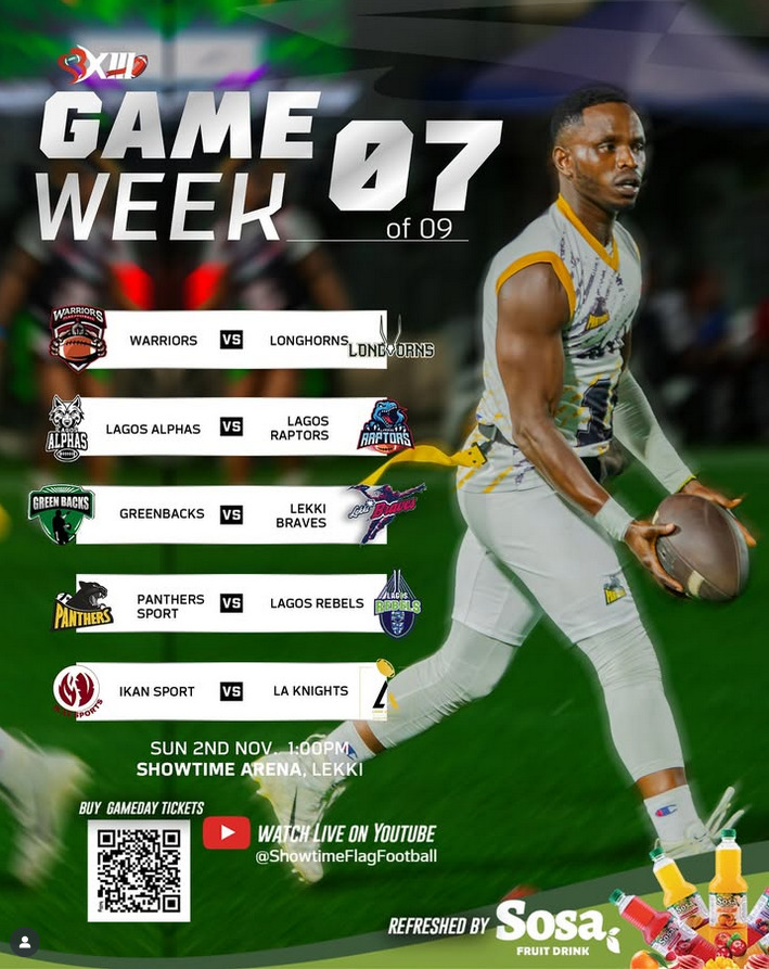 The defending champions Warriors Flag Football kick off the action against the Mainland Long Horns, knowing that another win could keep them within striking distance of first place. Lagos Alpha meet Raptors in a fiery contest that could decide who breaks into the top four, while Greenbacks face Lekki Braves in a battle of pride and redemption.
