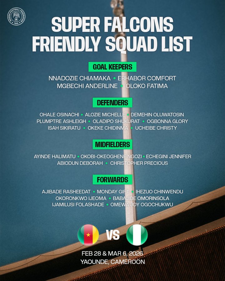 SUPER FALCONS FOR FRIENDLY MATCHES VS CAMEROON:
