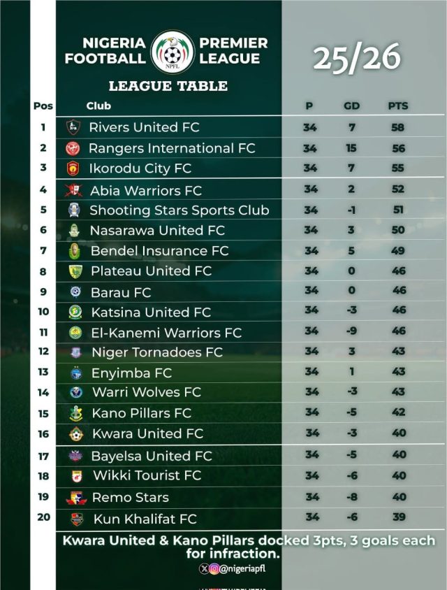 The result significantly boosts El-Kanemi Warriors’ standing, lifting them to 46 points after 34 matches as they continue their push toward a respectable mid-table finish.