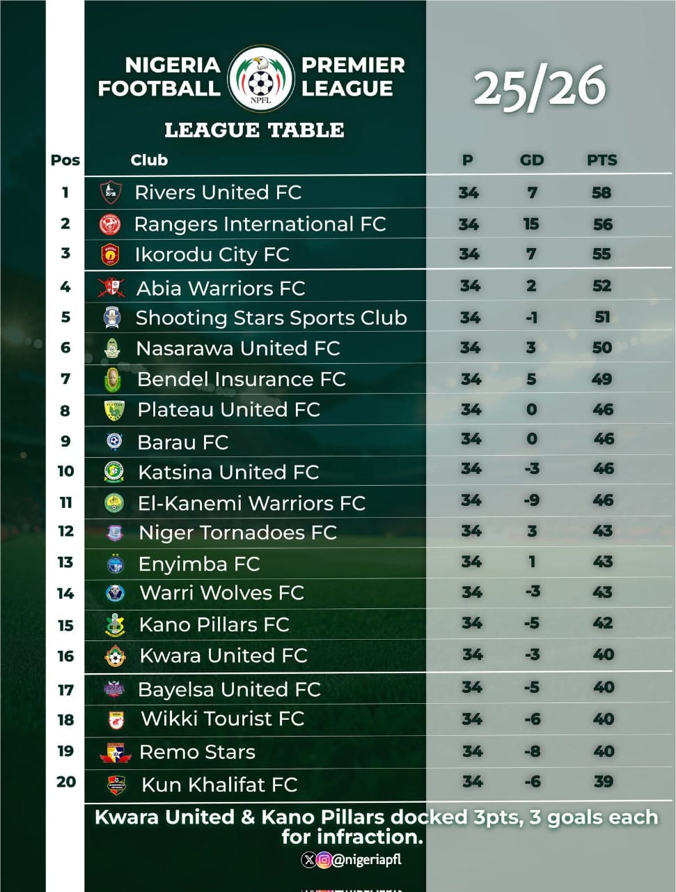 Heading into the final four games of the campaign, the pressure continues to mount on Nasarawa United to respond, while El-Kanemi Warriors will look to build momentum from this crucial win.