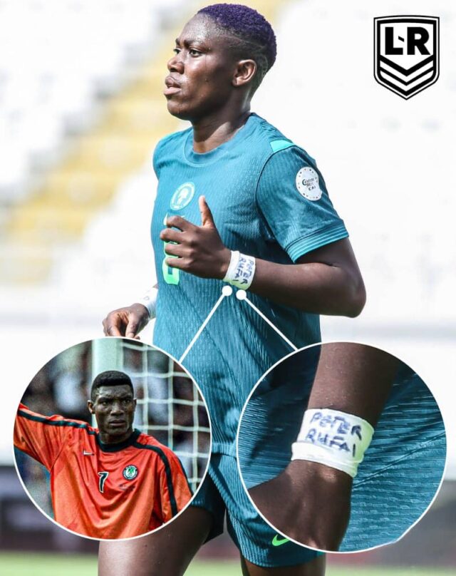 Oshoala wore a white wristband inscribed with “Peter Rufai” during the game — a heartfelt gesture to honour the former national team goalkeeper.
